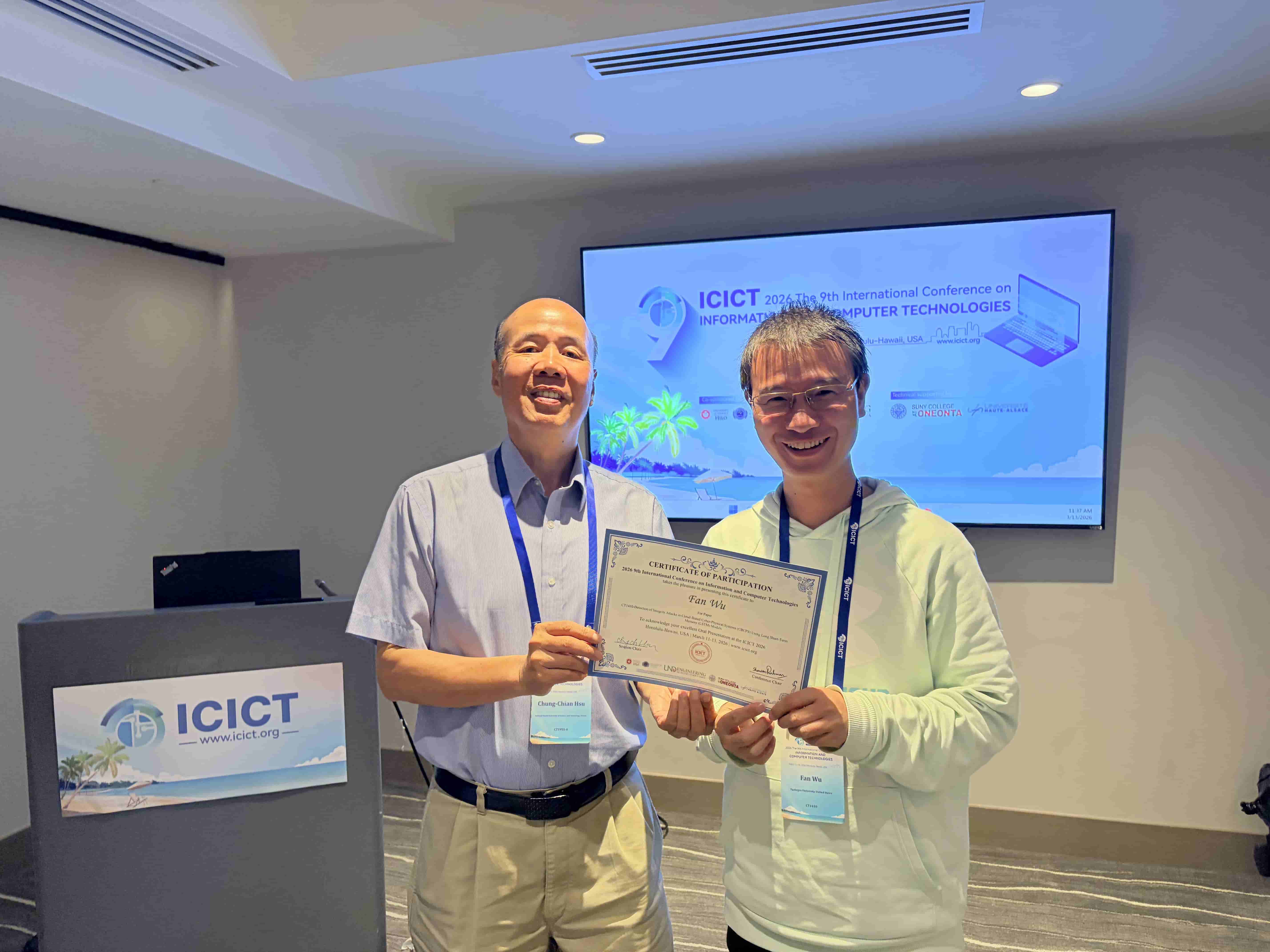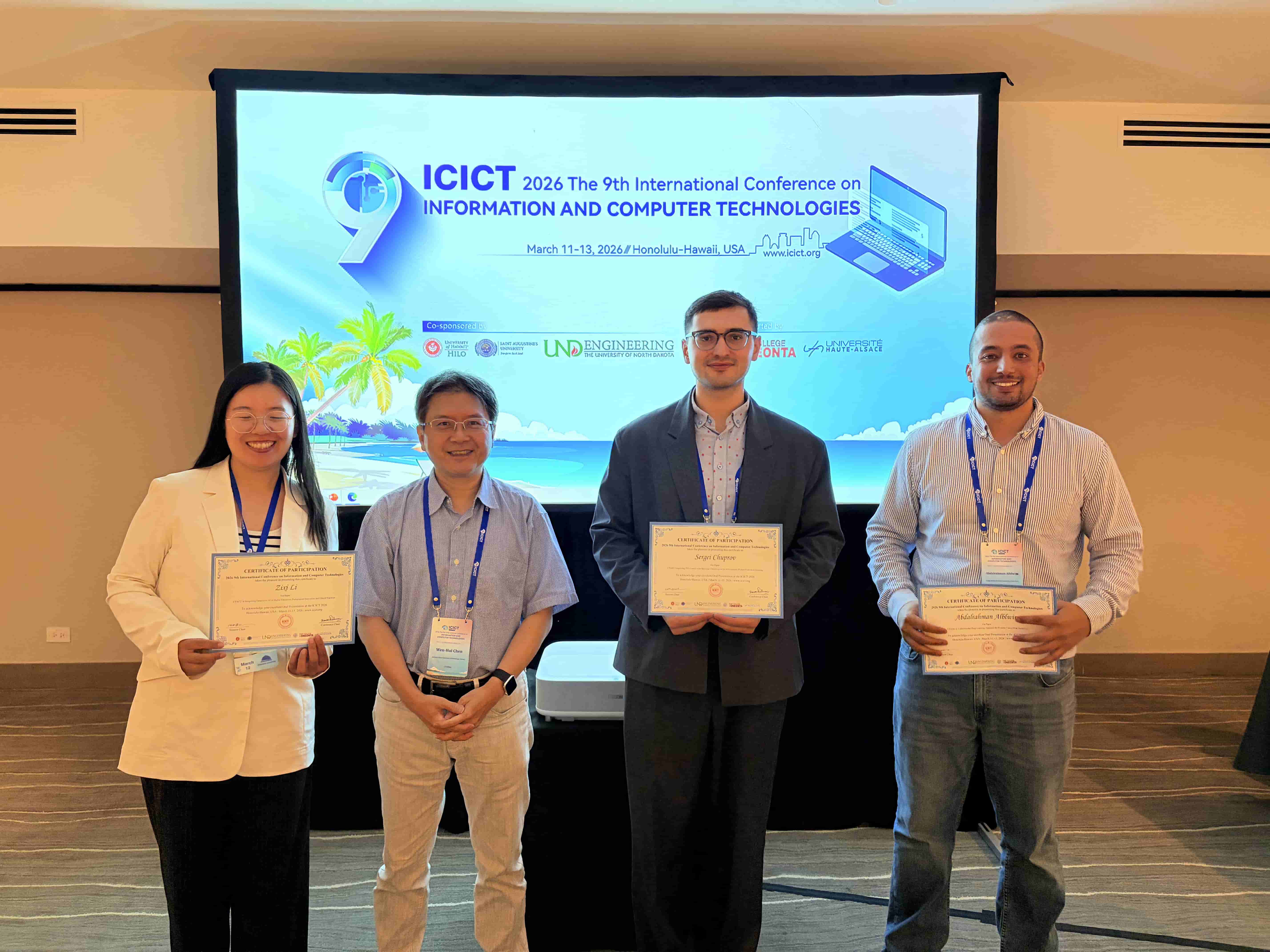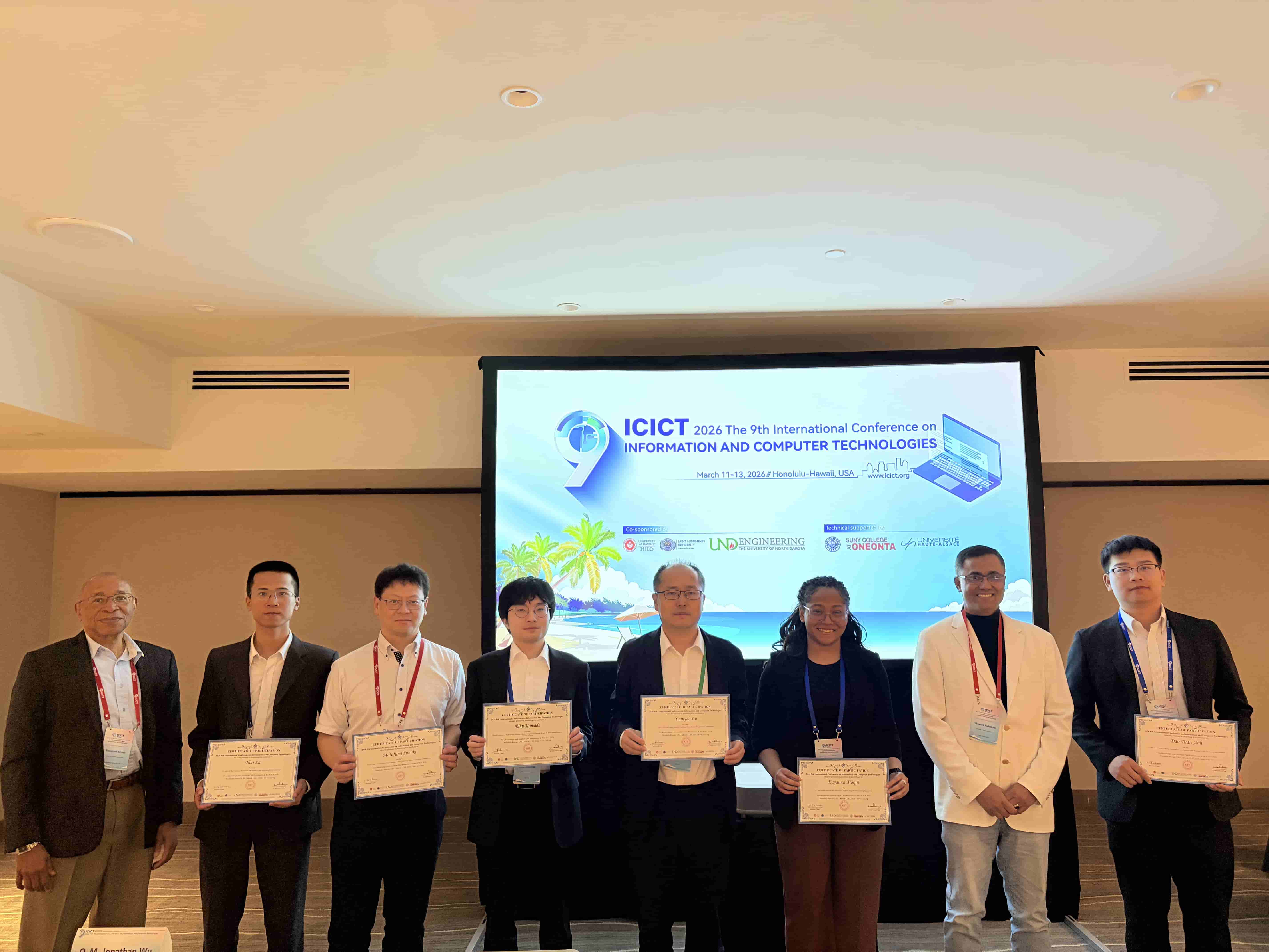 ICICT 2026 – The 9th International Conference on Information and Computer Technologies was successfully convened, with over 100 participants representing diverse countries and regions. The conference program included two distinguished keynote speeches, a Best Student Paper Competition, six parallel sessions, and four online sessions. The thematic scope encompassed Image Processing and Computer Vision; Natural Language Processing and Large Language Model Technologies; Software Engineering, Data Engineering, and Human-Computer Interaction; Foundational AI Theory and Interdisciplinary Applications; as well as Network and Information Security (including Wireless Networks and AI Security). During the conference banquet, the Conference Chairs officially announced the recipients of the Best Student Paper Award and six Best Oral Presentation Awards.