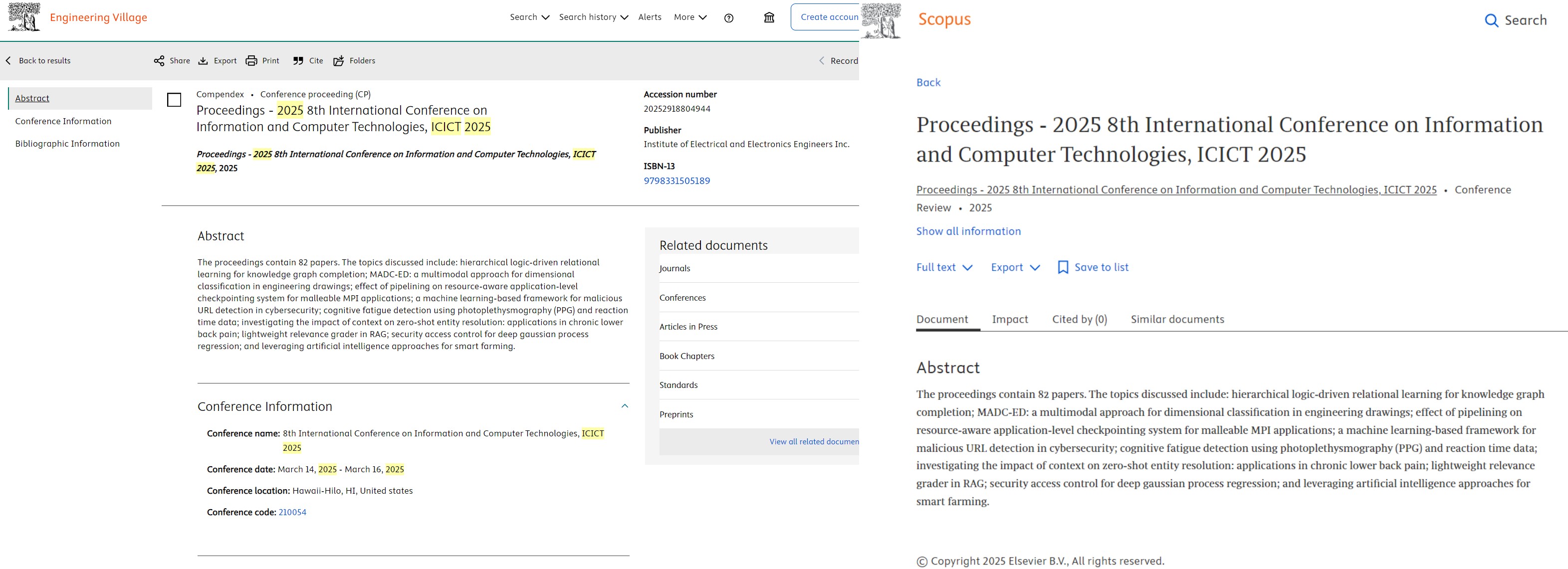 ICICT 2020,ISBN: 978-1-7281-7283-5 (online), Ei & Scopus index ICICT 2019, ISBN: 978-1-7281-3322-5 (online), Ei & Scopus index ICICT 2018, ISBN: 978-1-5386-5382-1 (online), Ei & Scopus index |